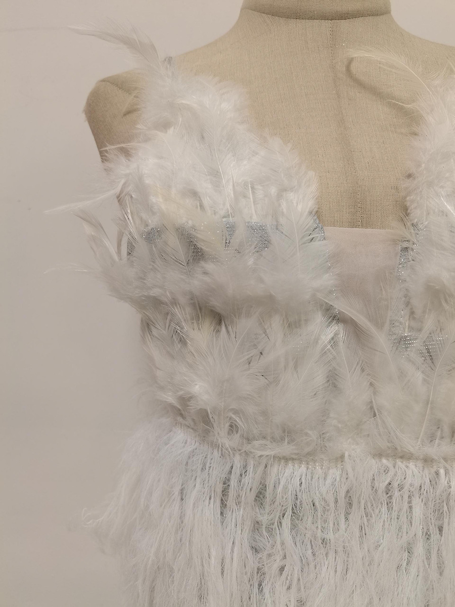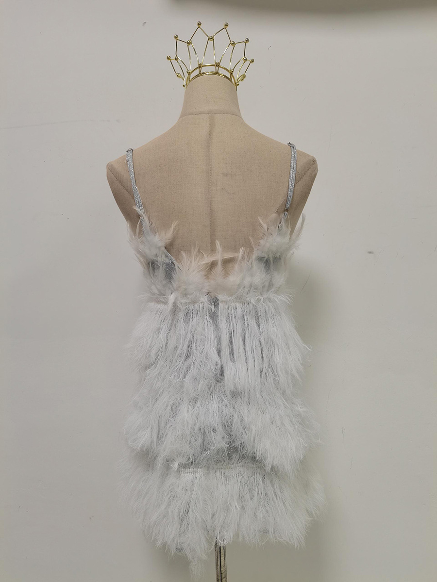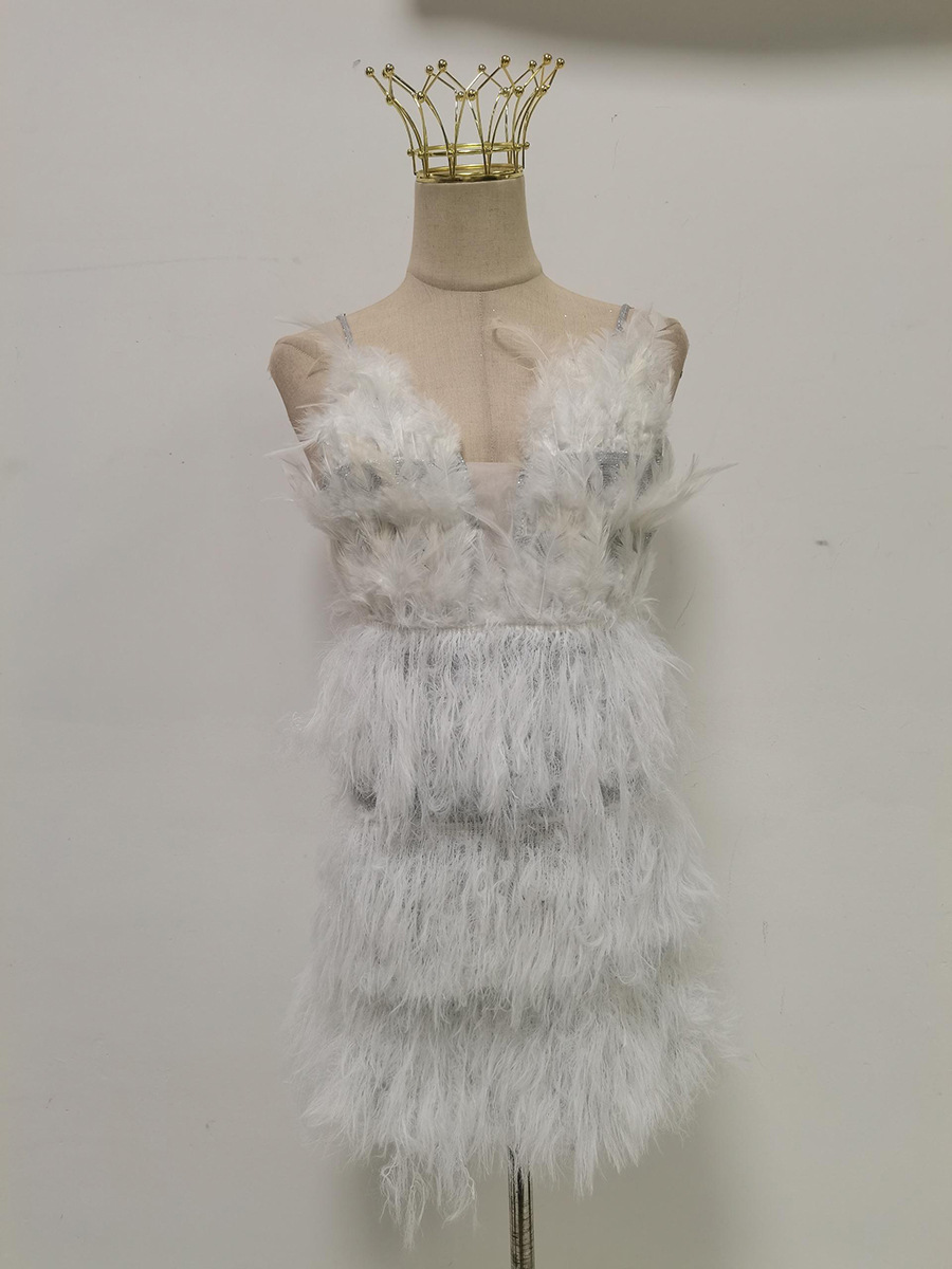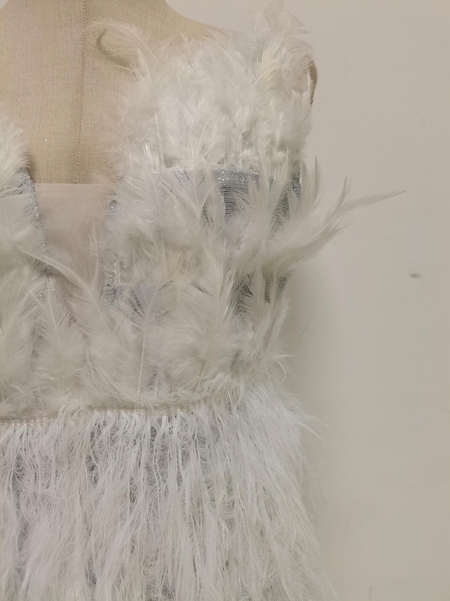 French Solid Color Waist Tight Feather Cami Dress Autumn Elegant High Sense Dress Women
