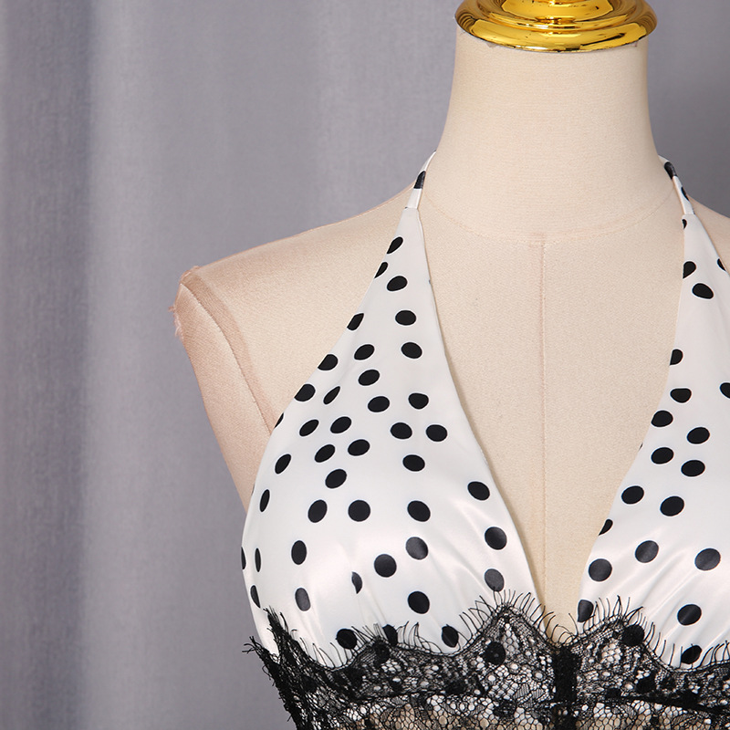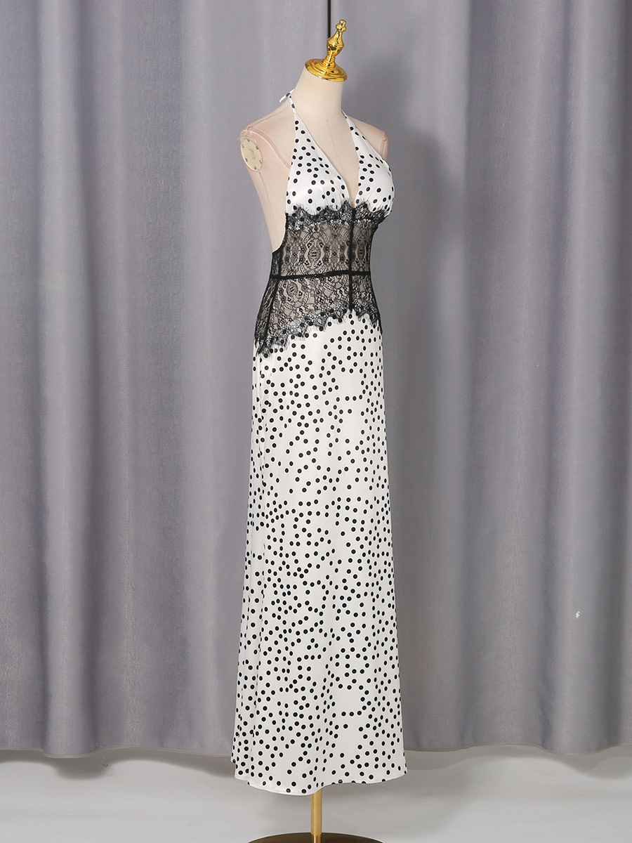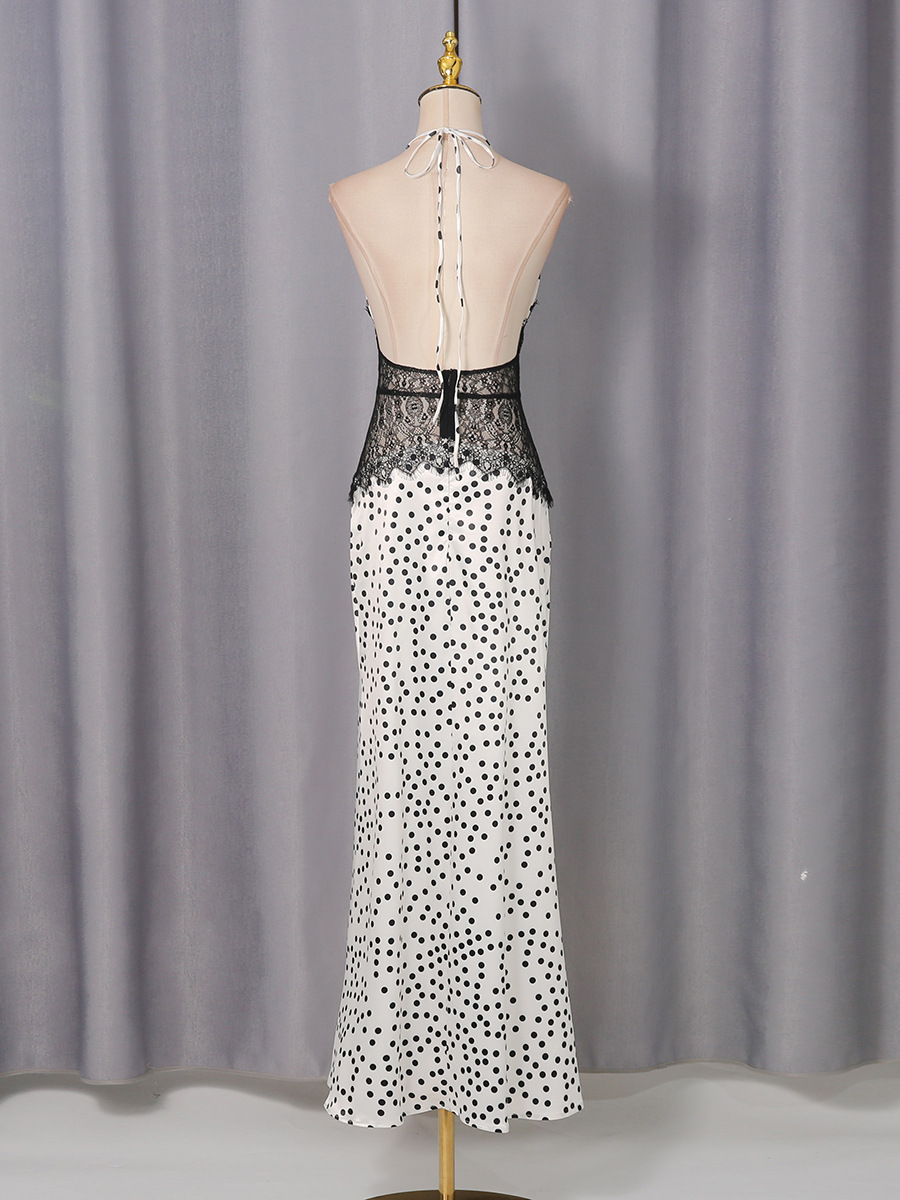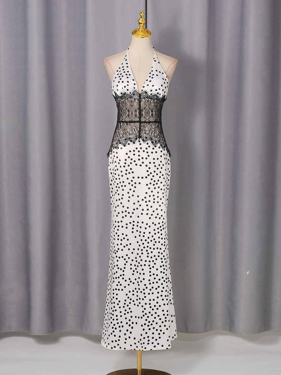 High Grade Elegant Polka Dot Lace Patchwork Waist Slimming Halter Sexy Dress Women