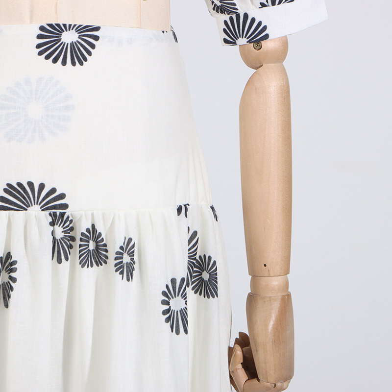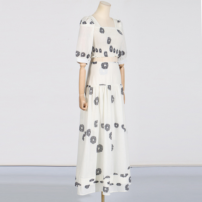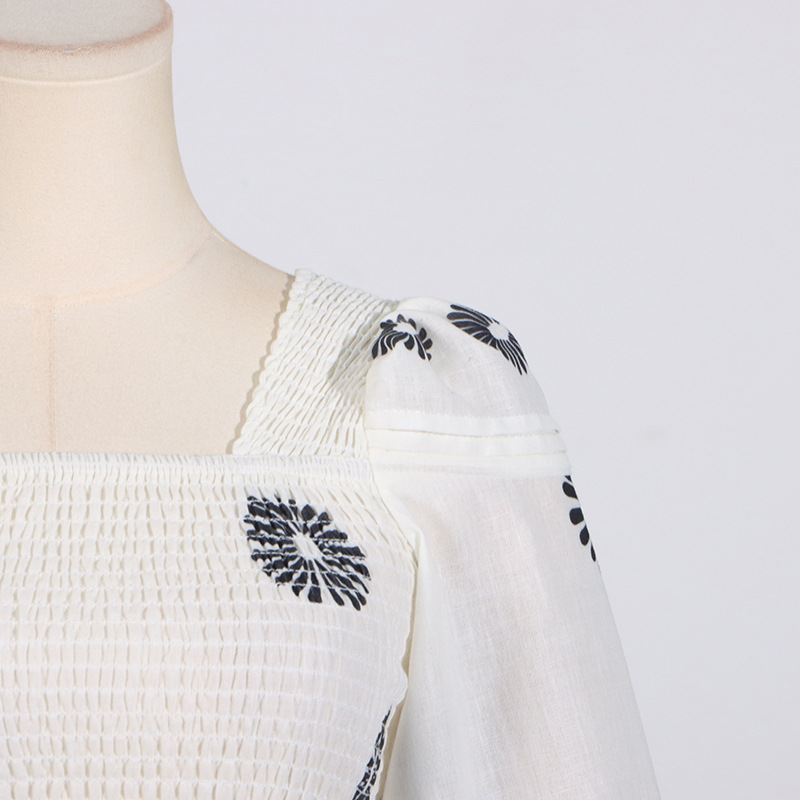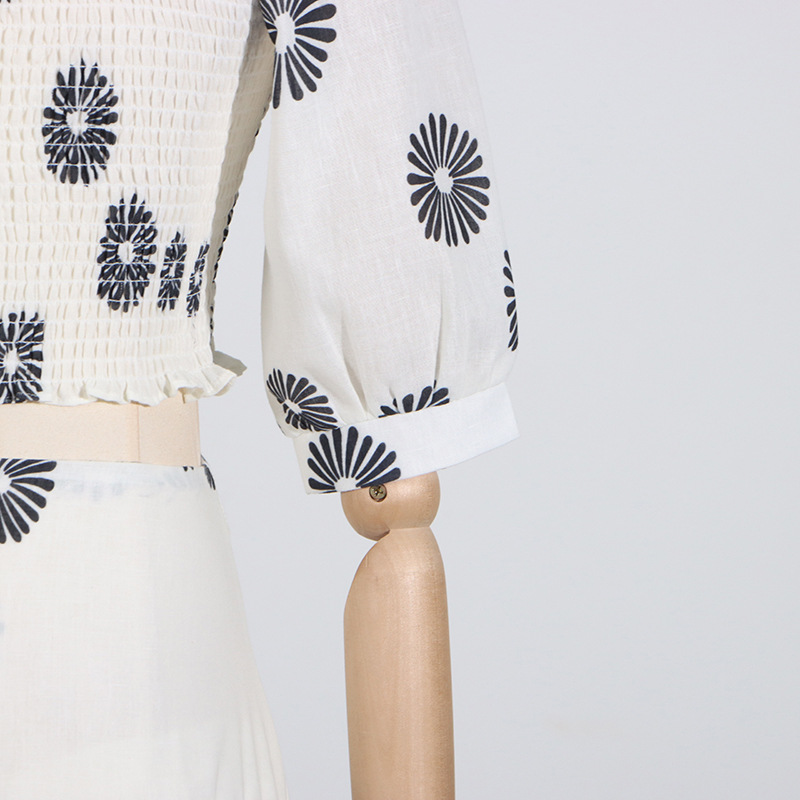 Korean Casual Summer Square Collar Puff Sleeve Peplum Top High Waist Print Skirt Set