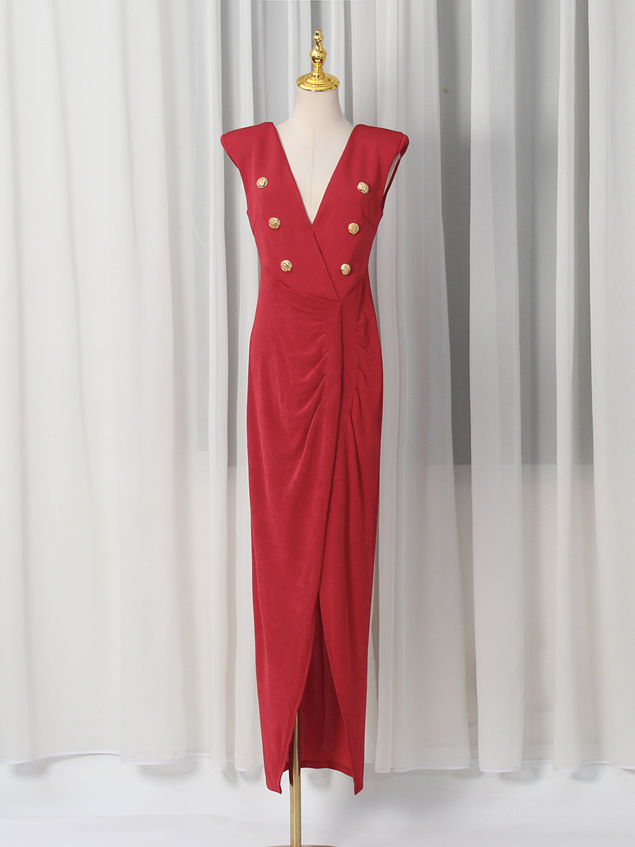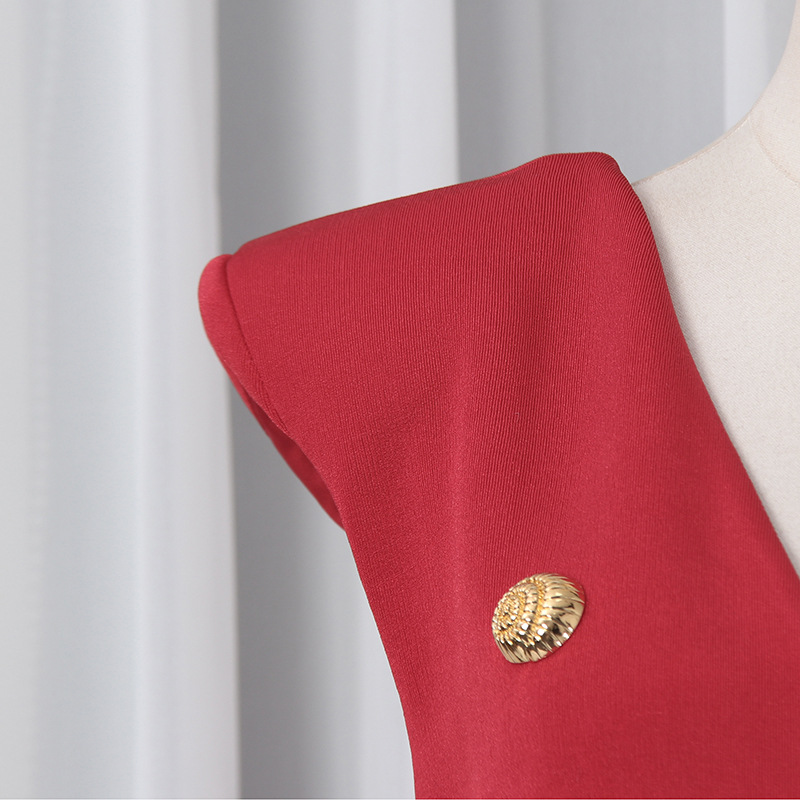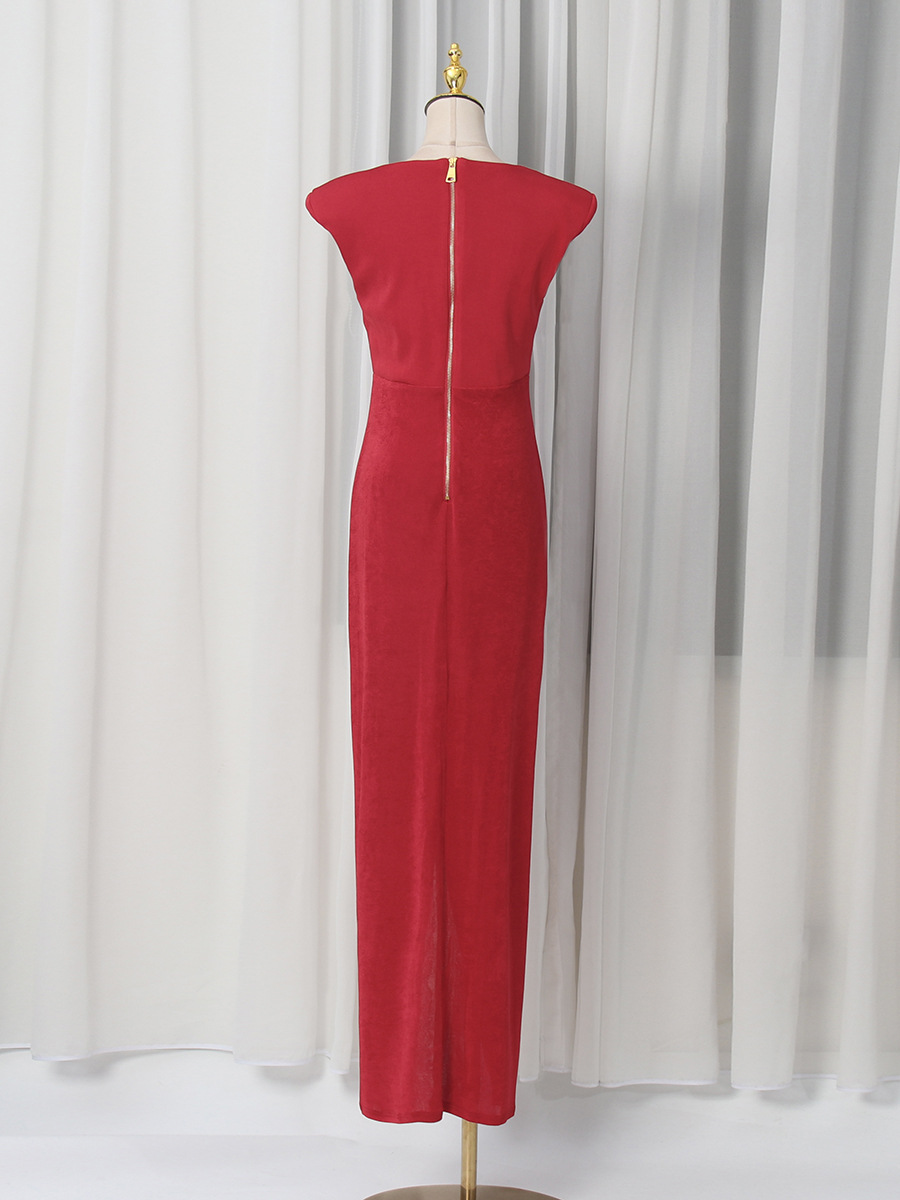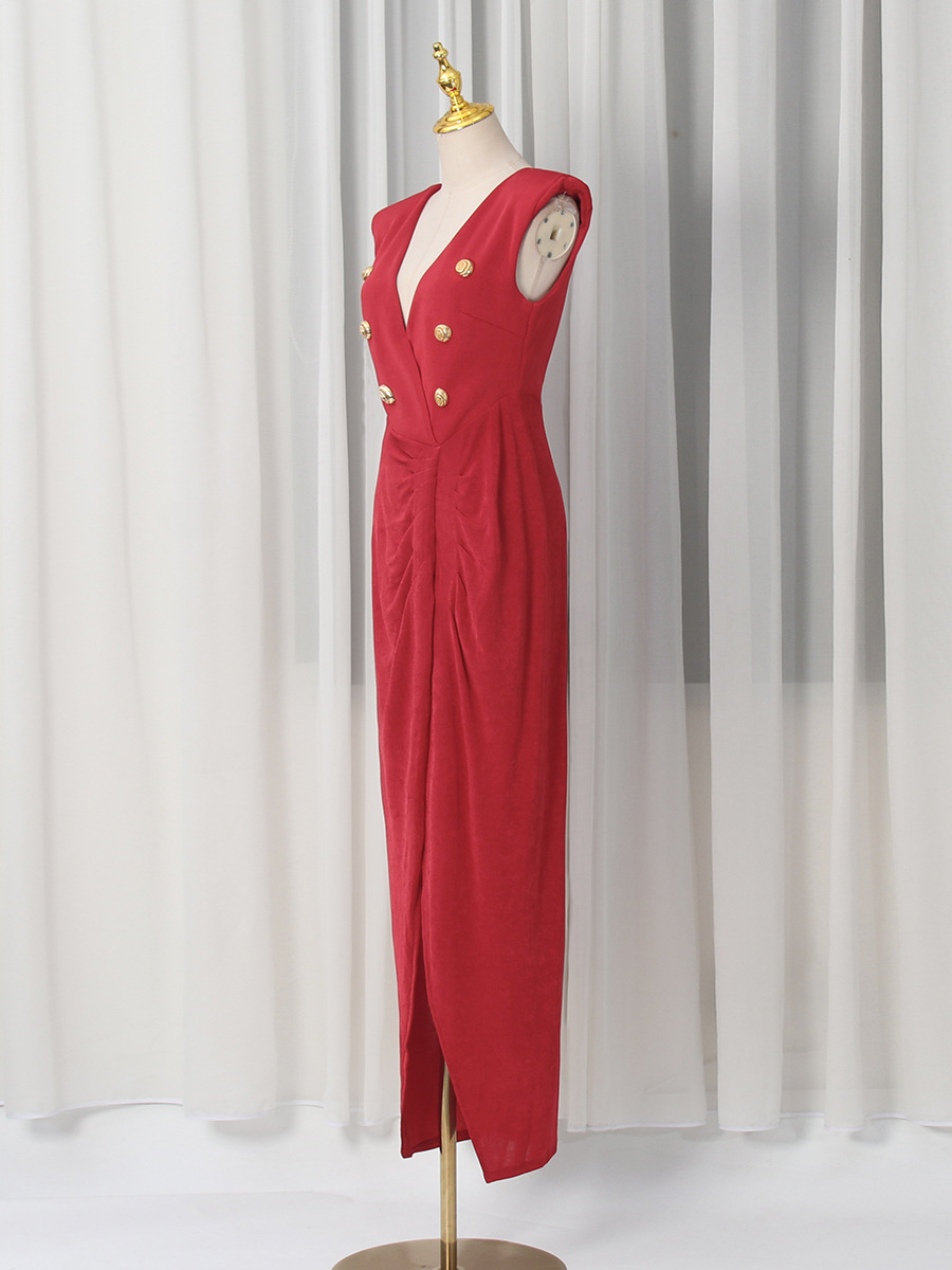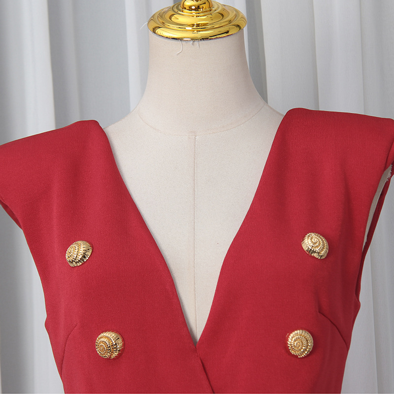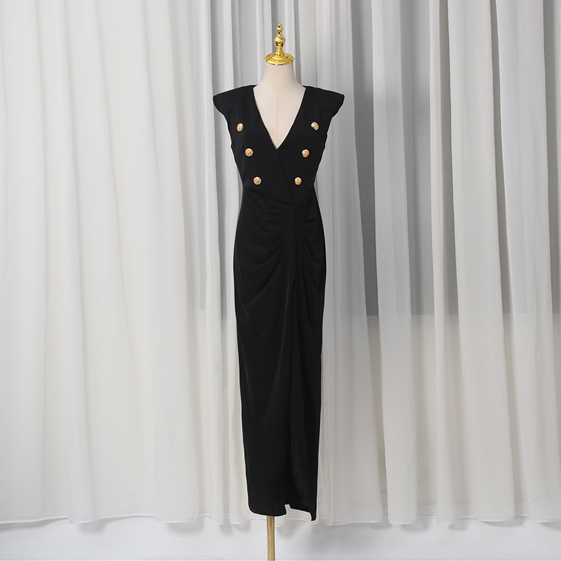 Spring V neck Sleeveless Design Split Dress Tight Waist Slimming Metal Decorative Dress Women